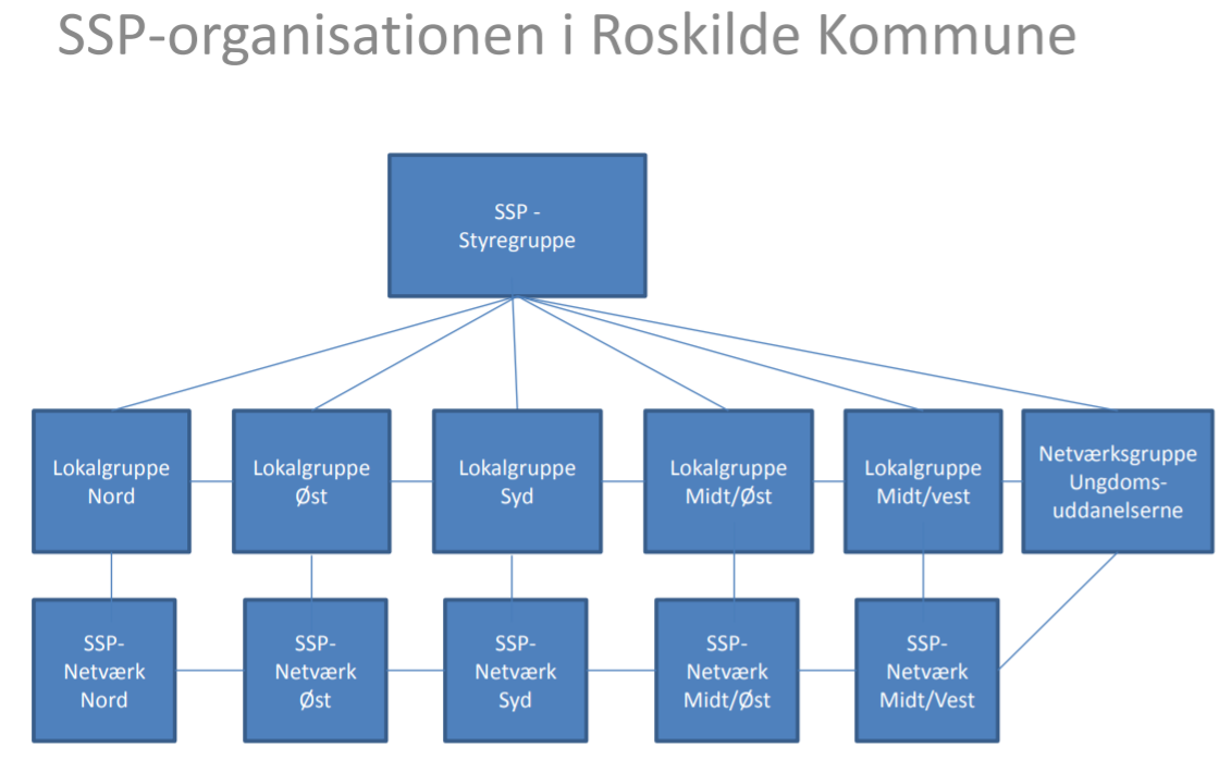 SSP Samarbejdet er et tværfagligt samarbejde mellem Roskilde Kommunes afdelinger Skole og Klub, Børn og Unge og Politiet. Det er organiseret på en måde, så alle, der har med børn og unge at gøre, samarbejder om at koordinere forebyggelse og hjælp - i samarbejde med børnene, de unge og deres forældre.